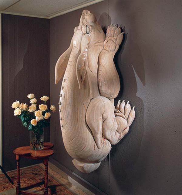 After one particularly busy-and sleepless-period, Jözef created the vertical piece "Wall Rabbit" of cardboard to mimic an apparition he saw while working late at night. "Cardboard is such a lowly material to work in," the sculptor notes, "but when it's sanded enough it takes on the appearance of velvet.